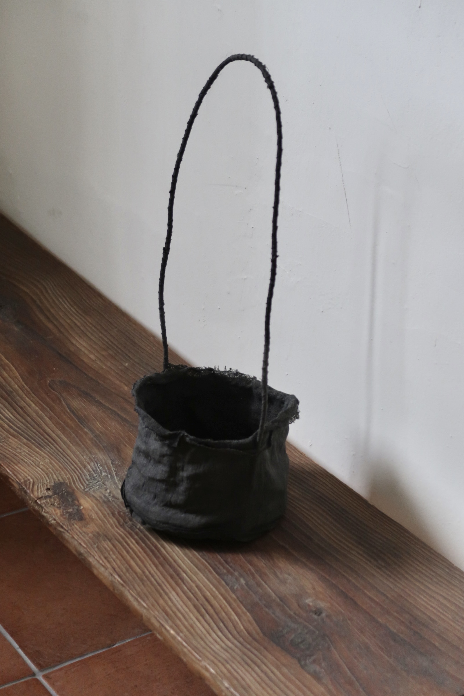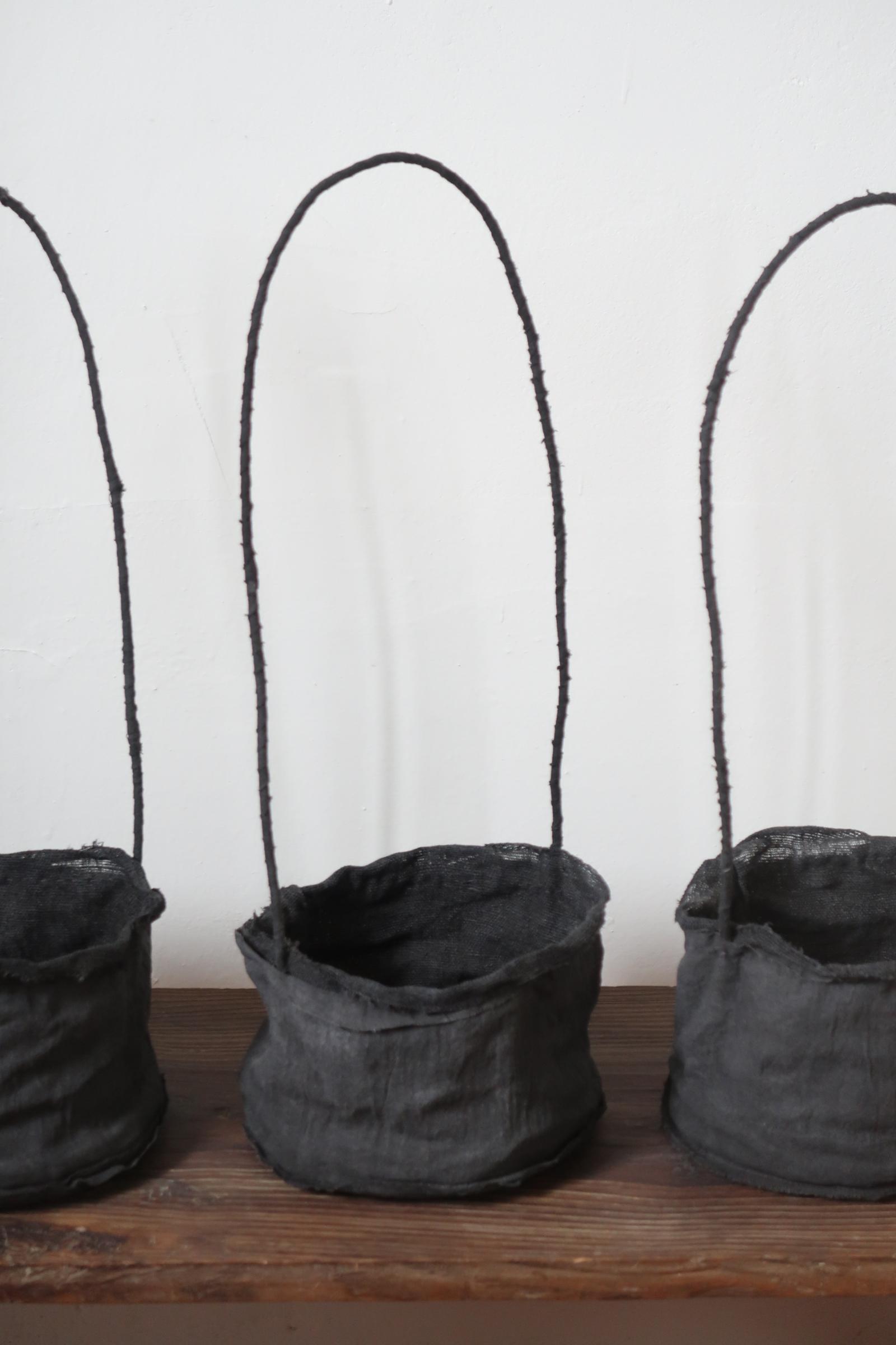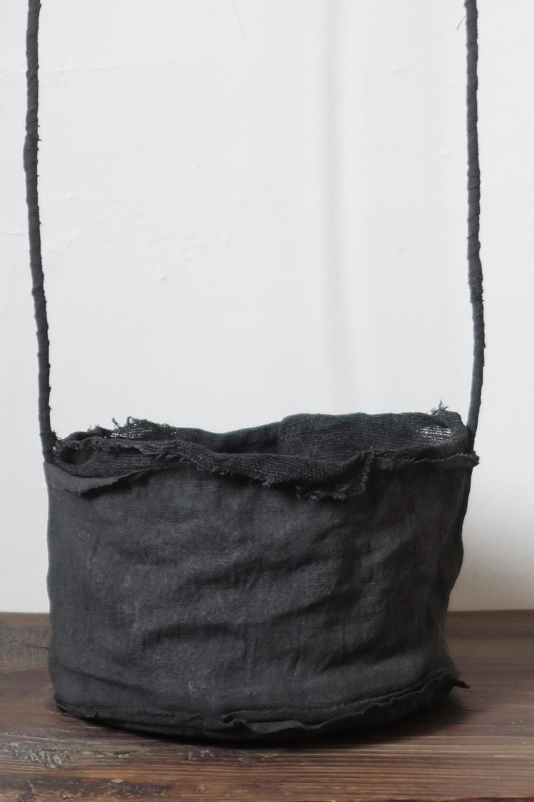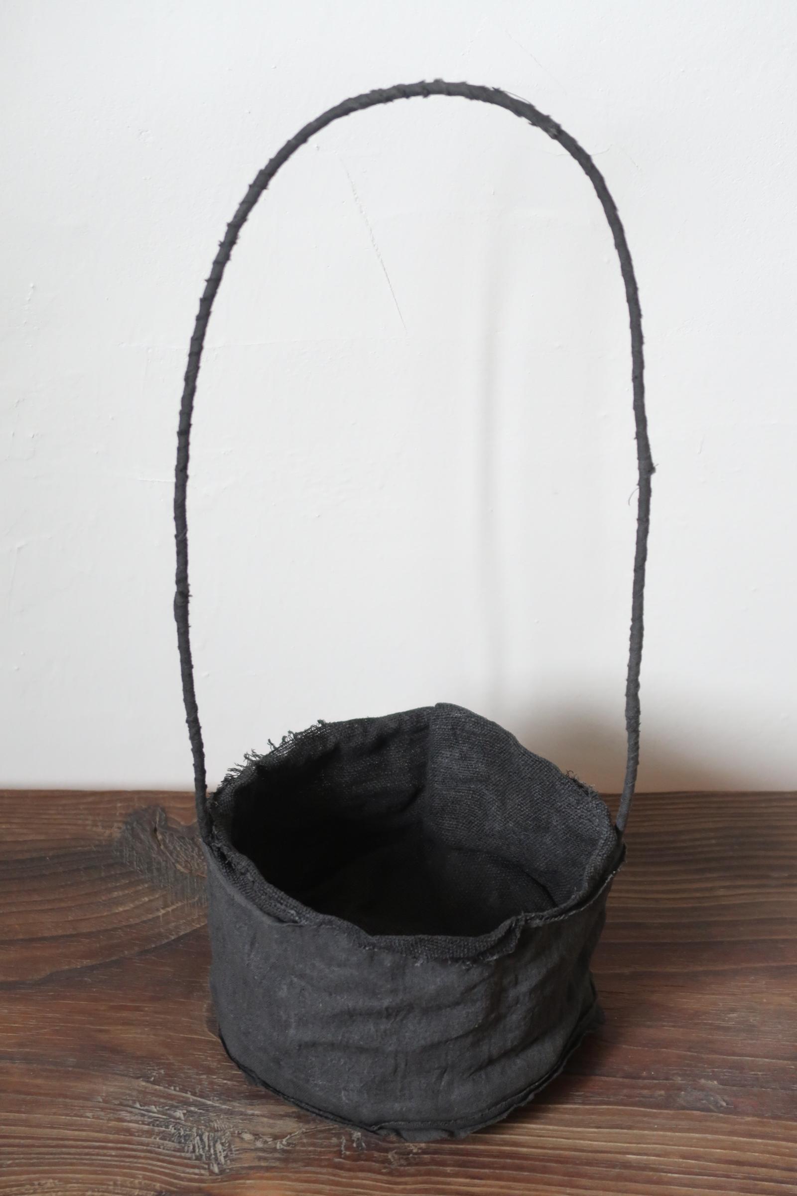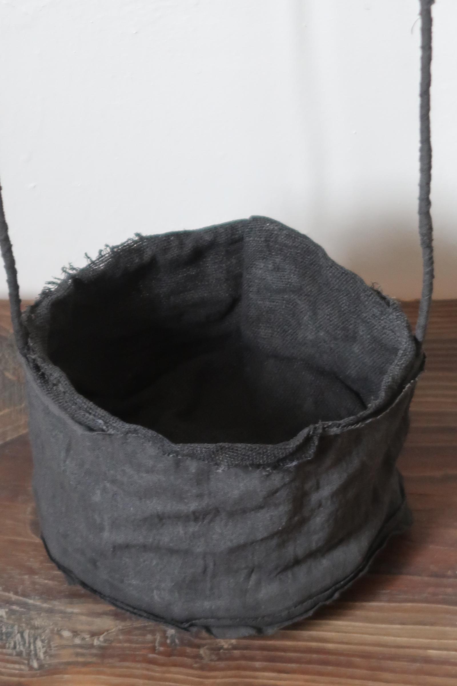 겉면과 안감을 이루는 면과 삼베를 여러 차례 먹염(墨染)해 색을 쌓고, 감물염으로 마무리한 분재 바구니입니다.